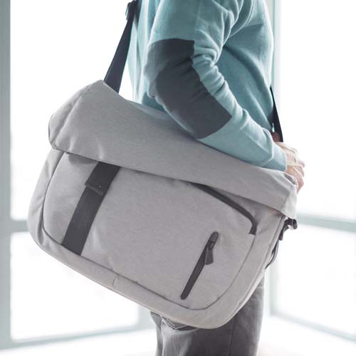 Stylish satchel made from RPET material, fits 15" Laptop & Tablet, padded interior, zippered outside pocket, padded shoulder strap and large buckle closure. Supplied in polybag. Registered Design