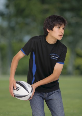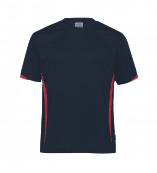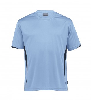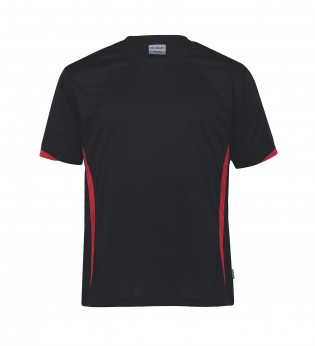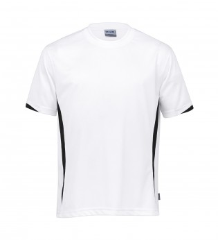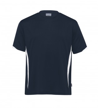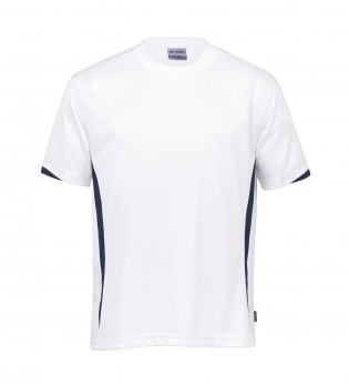 140gsm 100% micro poly eyelet mesh | Moisture wicking | UV protection | Classic fit | Contrast panels on front and half cuff | Self fabric crew neck | Twin needle detailing | Side splits at hem | DRI GEAR side pip