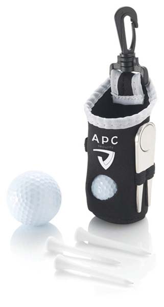 This convenient pouch holds all your tools together. If you squeeze the pouch, a golf ball will pop out the bottom, you'll always have a ball by hand. On one side you'll find 3 wooden tees, on the other a ball marker and repair tool. Two golf balls included. Neoprene.
