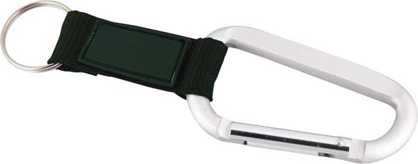 Heavy duty satin finished Carabineer, black webbing with brand able PU patch and split-ring. Boxed.