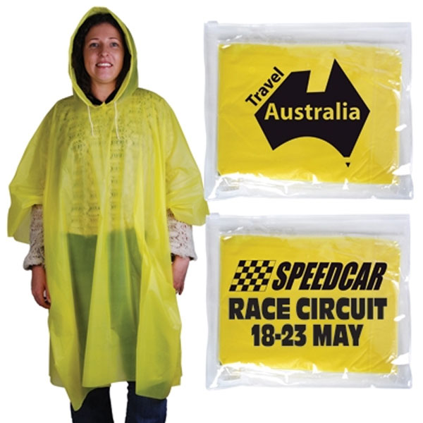 PVC poncho with drawstring hood. Packed folded in clear PVC pouch for reuse.