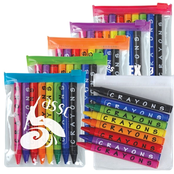 Colour/s:Crayon Colours include: Assorted Black, Blue, Green, Orange, Pink, Purple, Red, Yellow. Pouch colours include: Assorted Orange, Pink, Purple, Blue, Green and White zip lock strips.
