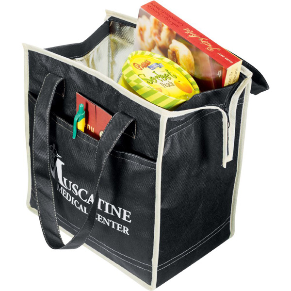 PolyPro Non-Woven Quilted Insulated Tote Keeps your goods cool after a trip to the grocery store. Perfect alternative to plastic bags. Insulated with heat-sealed water-resistant lining. Zippered main compartment. Open front pocket. Quilted diamond material accents; contrast binding and stitch details. Reinforced handles and binding on edges for added durability. 17.5cm handle drop height.