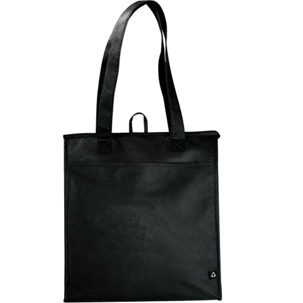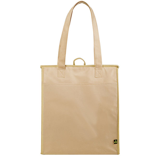 Insulated interior with zippered main compartment and front pocket. 28cm handle drop height, interior fabric loop. Reinforced handles and binding on edges for added durability. Polybag
