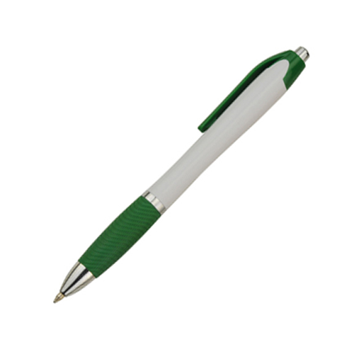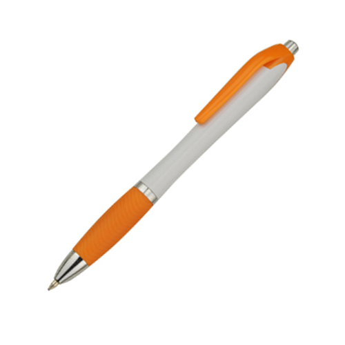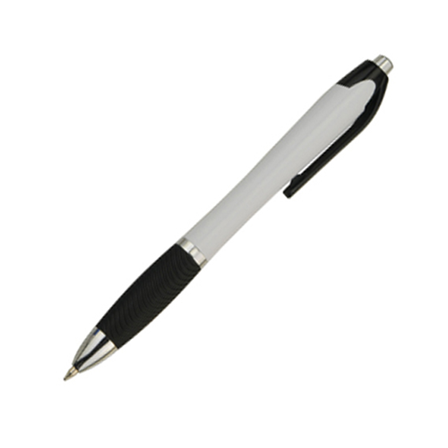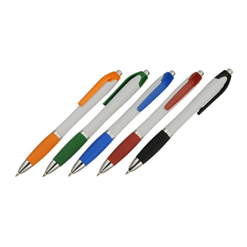 Push Action Plastic Pen, White Opaque Body with Contoured Rubber Grip and Matching Colored Clip