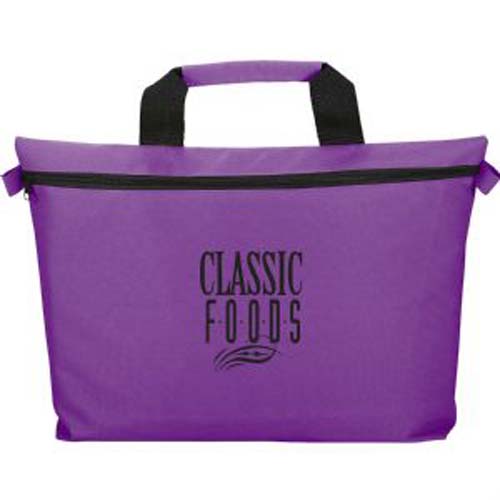 Zippered main compartment. Reinforced top carry handle with wrap. Pen not included.