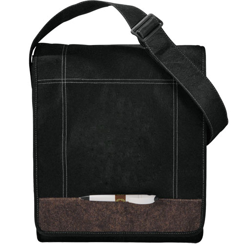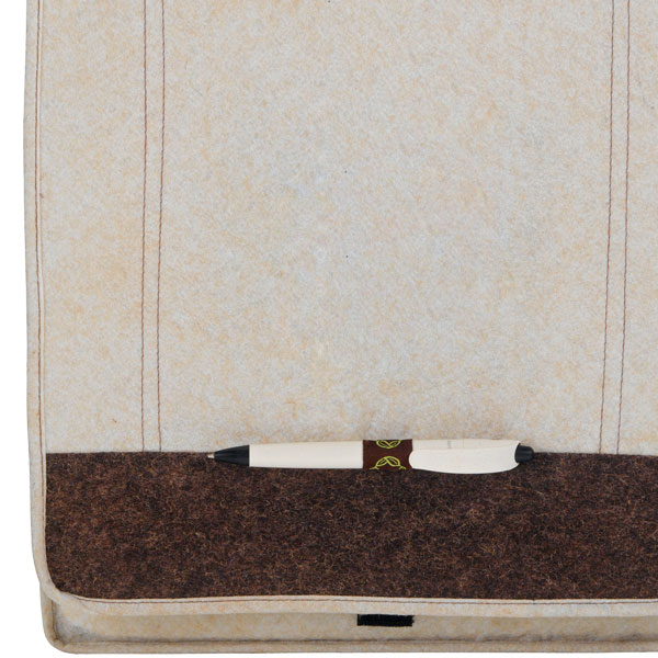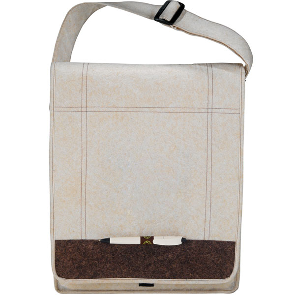 Open main compartment, velcro closure flap and front pen loop. With adjustable shoulder strap. Made of biodegradable and recycled materials Contrast stitching and reinforced handles for added durability. Holds up to 18kgs. Polybag