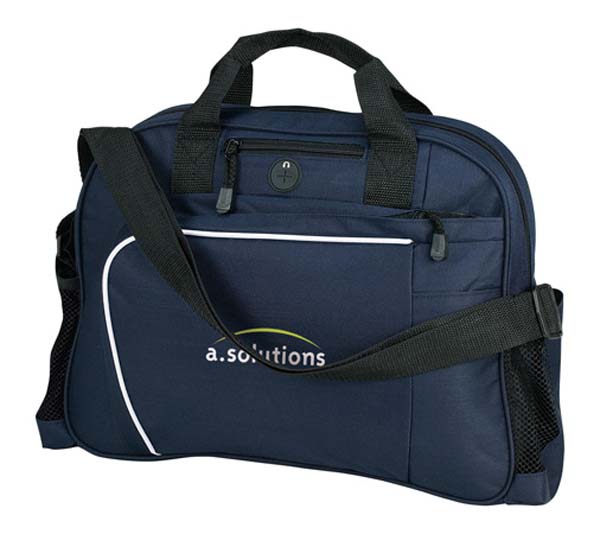 600D polyester curved zipped satchel with adjustable shoulder strap, zipper closure, mesh side pockets, front zipper pocket, cord port for Ipod.
