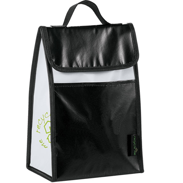 Laminated material is water resistant and hand-wipeable. Fully insulated main compartment. Fold-over top with velcro closure. Open front pocket. Contrast carry handle. Polybag
