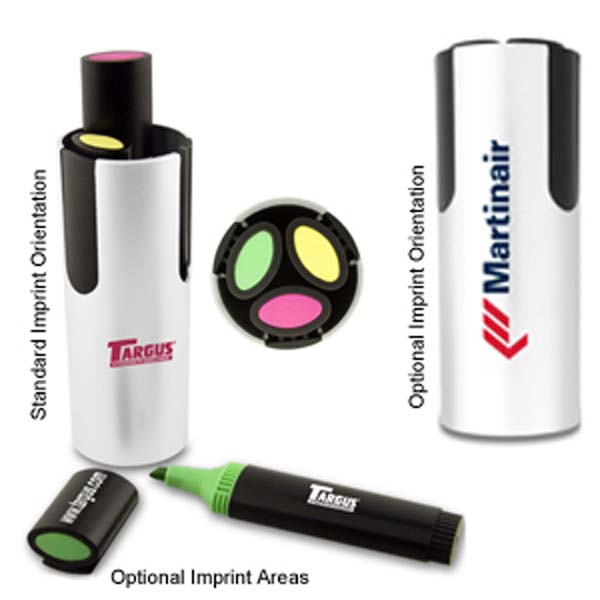 Set of yellow, pink and green pen highlighters with a pocket clip in a round plastic desktop holder.