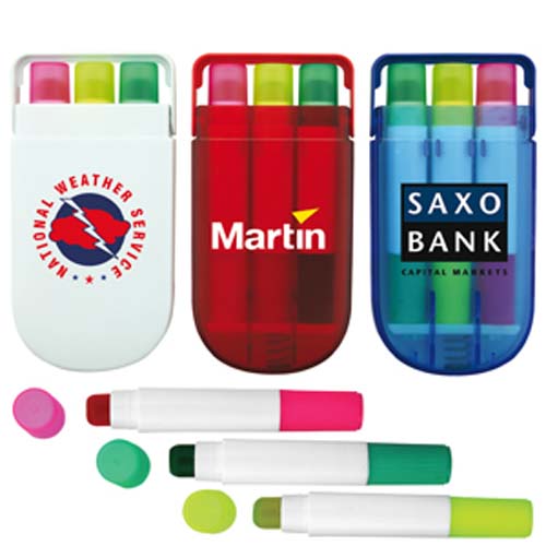 A set of 3 gel highlighters in a carrying case. The tip is formulated from a special gel so they will not smudge or dry out like other highlighters. This gives them an extremely long shelf life.