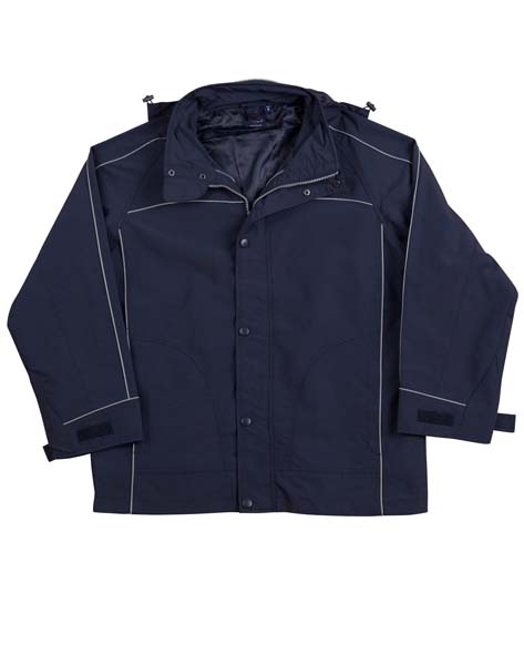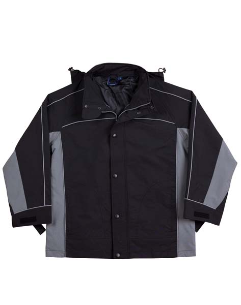 Description: Hideaway hood concealed in collar. Removable vest. Concealed embroidery access. Silver reflective piping.