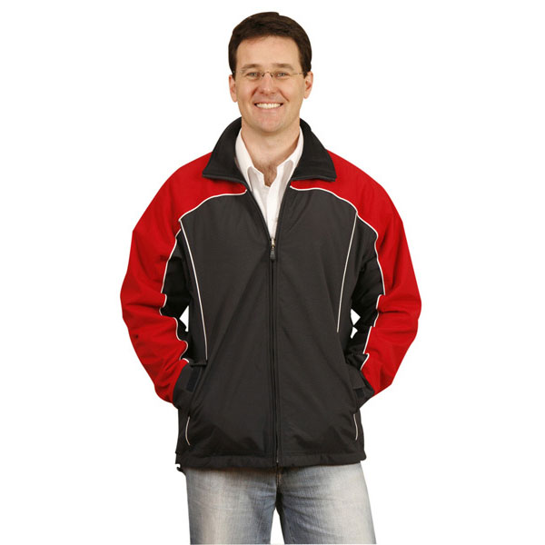 Description: Two tone reversible jacket with white piping. Double stitched seam across back and front. Adjustable cuffs and velcro tabs Two front pockets. Draw cord at hem. Concealed embroidery access. Wind and shower proof.
