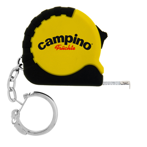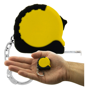 A mini tape measure keychain with a metal tape. Measures up to 1 metre. Metric and imperial measurements.