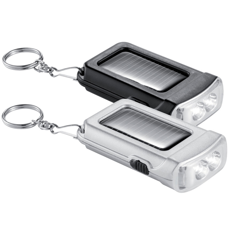 ECO Solar power torch with ABS body and panel, 2 white LED lights, keyring attached making it more convenient to carry. Slide on/off power button
