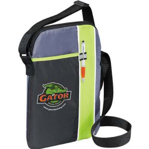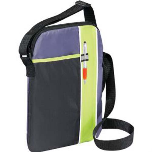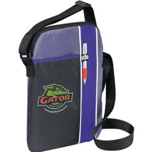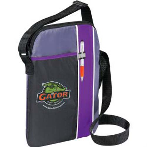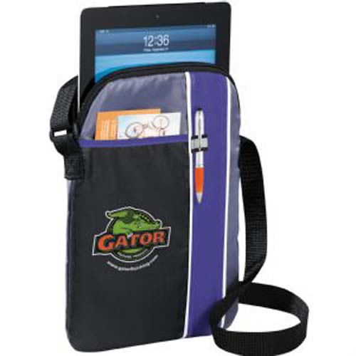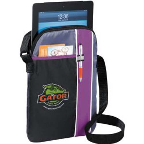 Zippered, padded main compartment holds most iPads, tablets and eReaders. Open front pocket. Stylus or pen loop. Adjustable shoulder strap. Media device and pen not included.