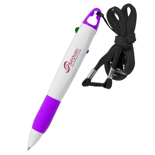 A 2 colour multiple ink pen and a lanyard with a breakaway safety release. Ink colours are blue and Red.